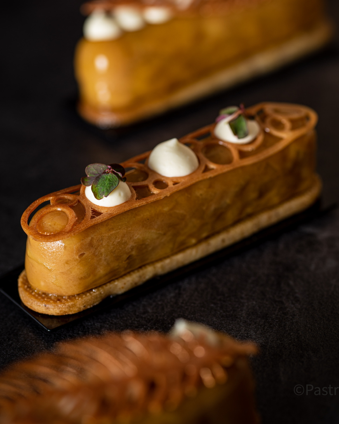 Jablečnou část oglazuj neutrální polevou a polož ji na sušenku.