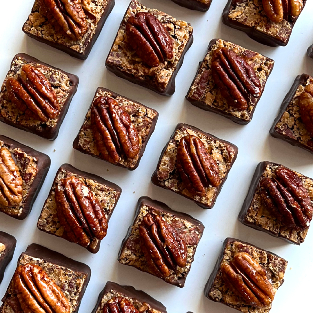 Mléčnou čokoládu rozpusť s kakaovým máslem a aplikuj při 35-40°C na zchlazené a nakrájené pekanové kostky.